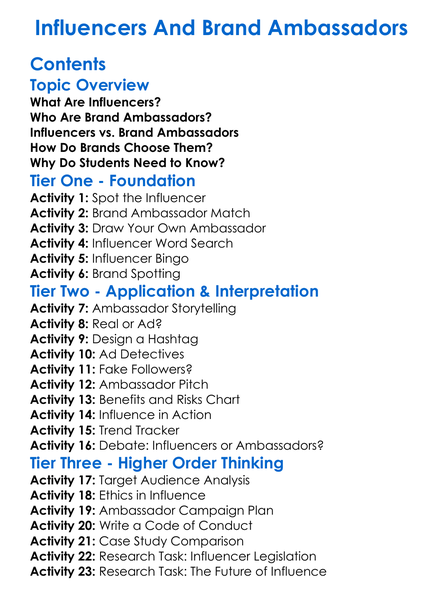 Influencers And Brand Ambassadors Worksheet Activity Booklet