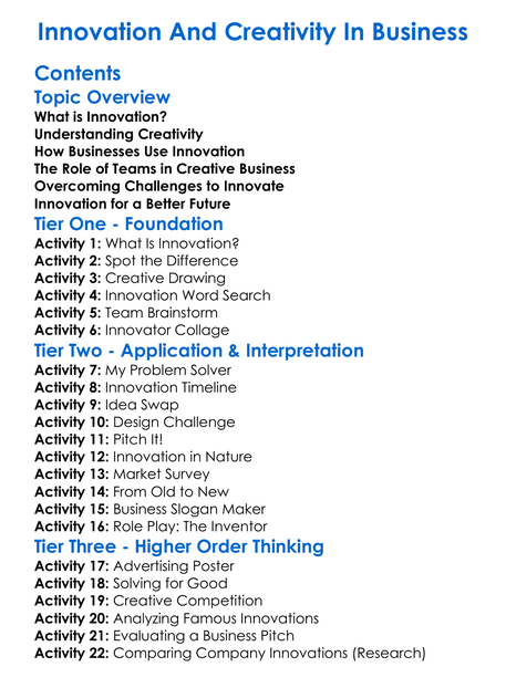 Innovation And Creativity In Business Worksheet Activity Booklet