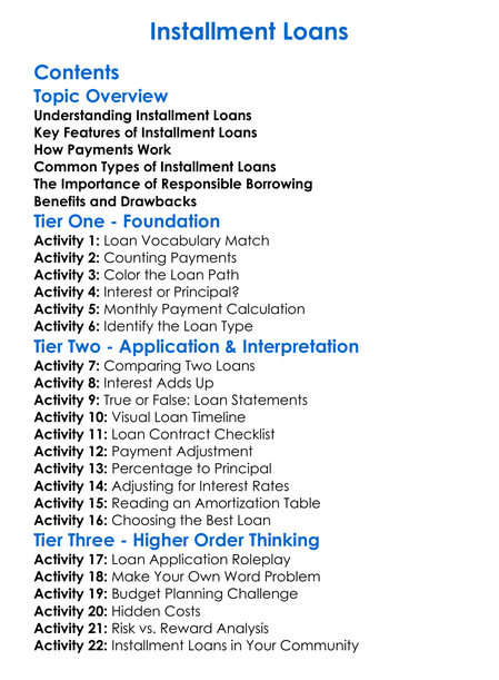 Installment Loans Worksheet Activity Booklet