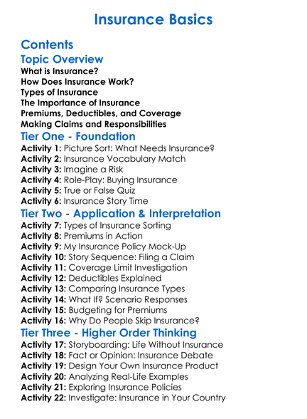 Insurance Basics Worksheet Activity Booklet
