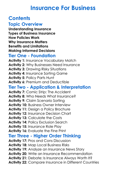 Insurance For Business Worksheet Activity Booklet