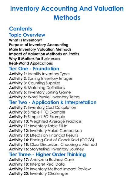 Inventory Accounting And Valuation Methods Worksheet Activity Booklet