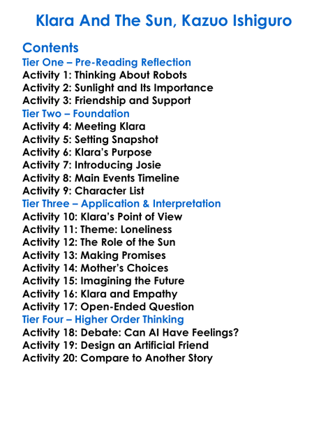 Klara And The Sun Kazuo Ishiguro Worksheet Activity Booklet