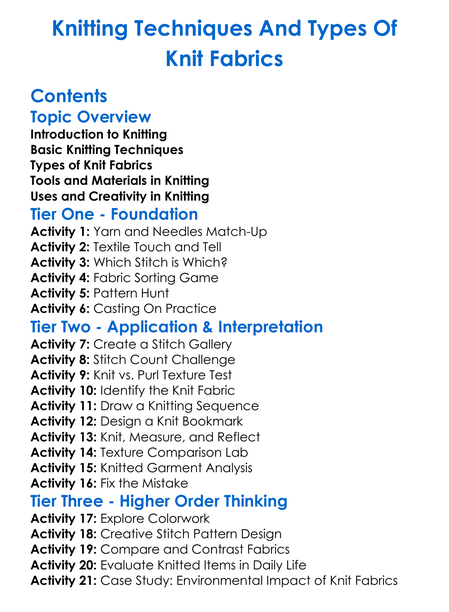 Knitting Techniques And Types Of Knit Fabrics Worksheet Activity Booklet