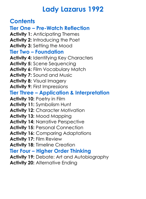 Lady Lazarus 1992 Worksheet Activity Booklet