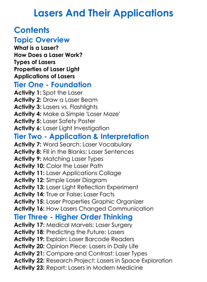 Lasers And Their Applications Worksheet Activity Booklet