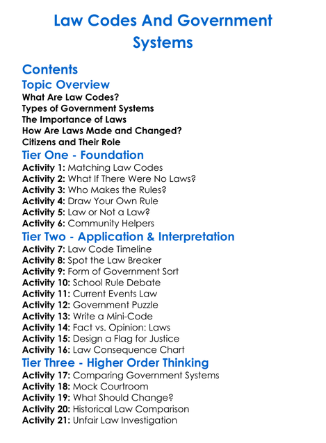 Law Codes And Government Systems Worksheet Activity Booklet