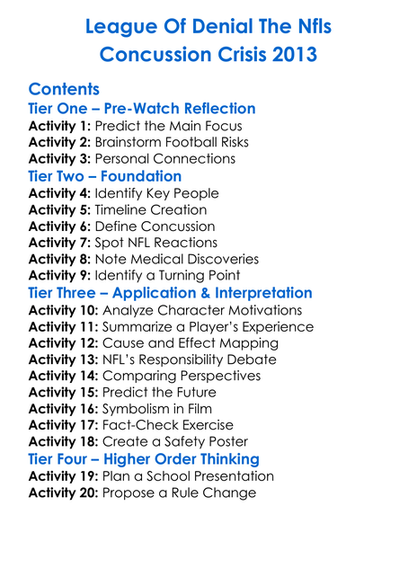 League Of Denial The Nfls Concussion Crisis 2013 Worksheet Activity Booklet