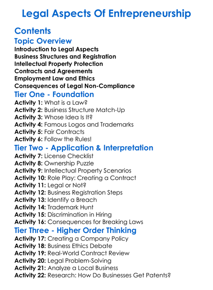 Legal Aspects Of Entrepreneurship Worksheet Activity Booklet
