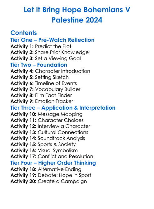 Let It Bring Hope Bohemians V Palestine 2024 Worksheet Activity Booklet