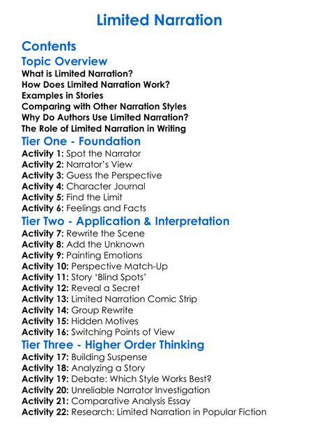 Limited Narration Worksheet Activity Booklet