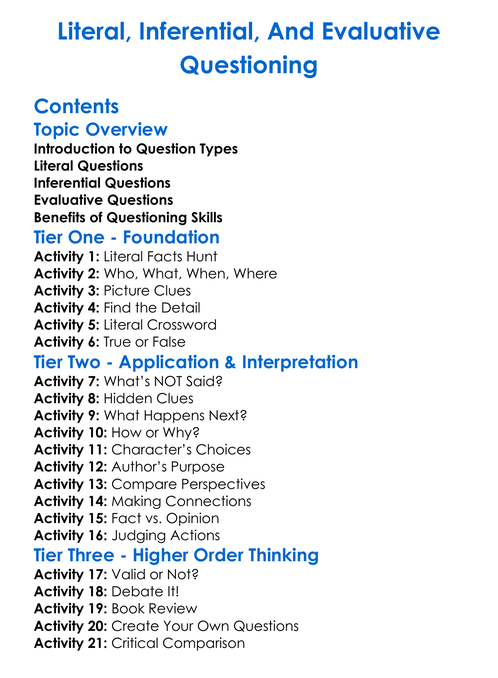 Literal Inferential And Evaluative Questioning Worksheet Activity Booklet
