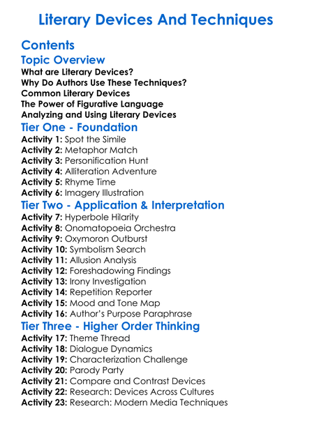 Literary Devices And Techniques Worksheet Activity Booklet