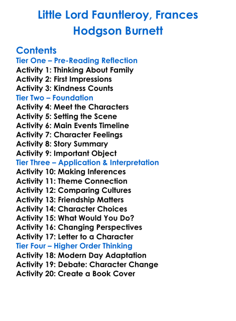 Little Lord Fauntleroy Frances Hodgson Burnett Worksheet Activity Booklet