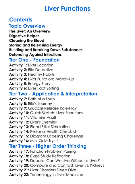 Liver Functions Worksheet Activity Booklet