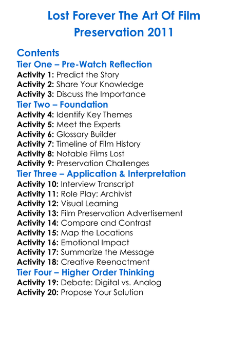 Lost Forever The Art Of Film Preservation 2011 Worksheet Activity Booklet