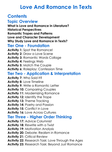 Love And Romance In Texts Worksheet Activity Booklet