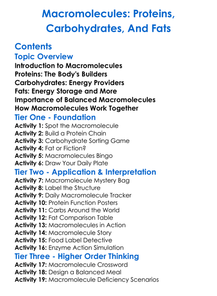 Macromolecules Proteins Carbohydrates And Fats Worksheet Activity Booklet