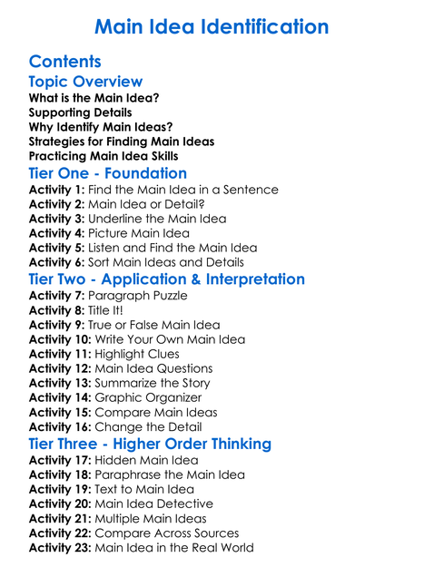 Main Idea Identification Worksheet Activity Booklet