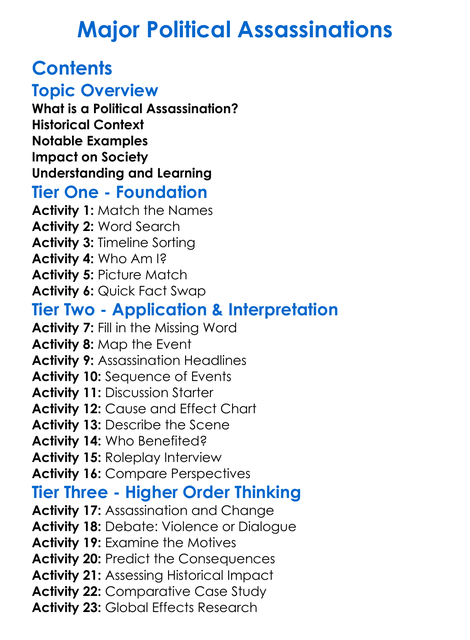 Major Political Assassinations Worksheet Activity Booklet