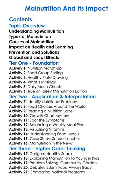 Malnutrition And Its Impact Worksheet Activity Booklet