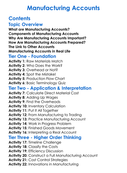 Manufacturing Accounts Worksheet Activity Booklet