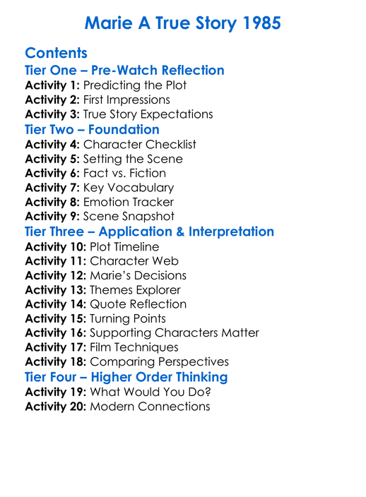 Marie A True Story 1985 Worksheet Activity Booklet