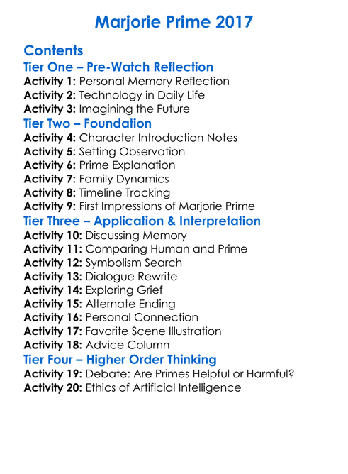 Marjorie Prime 2017 Worksheet Activity Booklet