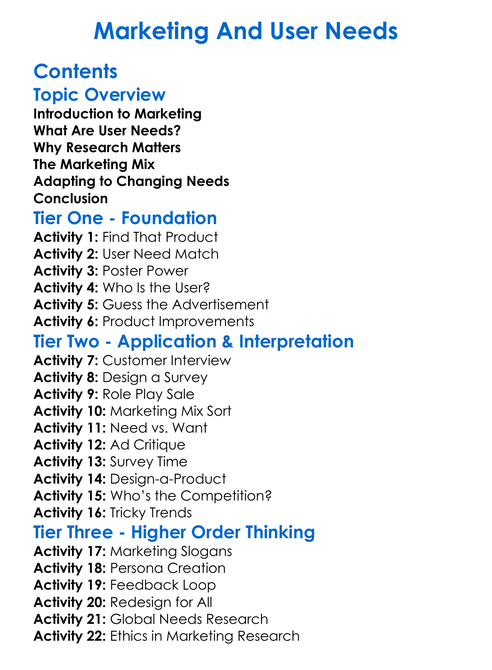 Marketing And User Needs Worksheet Activity Booklet