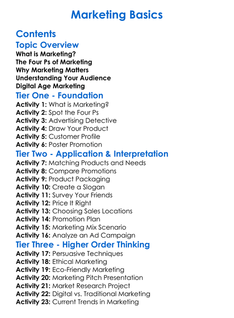 Marketing Basics Worksheet Activity Booklet