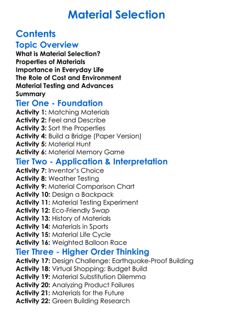 Material Selection Worksheet Activity Booklet