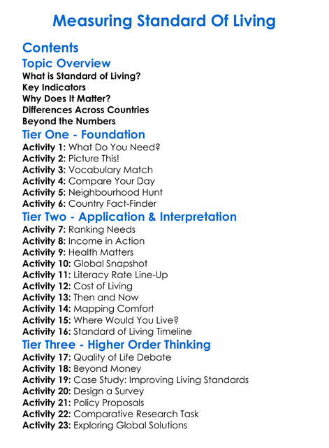 Measuring Standard Of Living Worksheet Activity Booklet