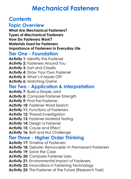 Mechanical Fasteners Worksheet Activity Booklet