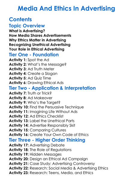 Media And Ethics In Advertising Worksheet Activity Booklet