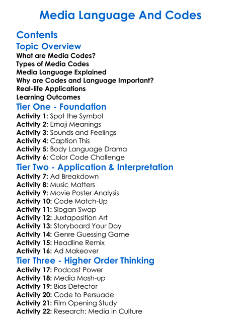 Media Language And Codes Worksheet Activity Booklet
