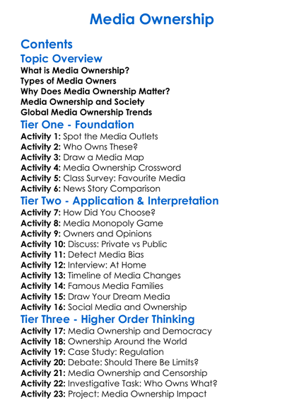 Media Ownership Worksheet Activity Booklet