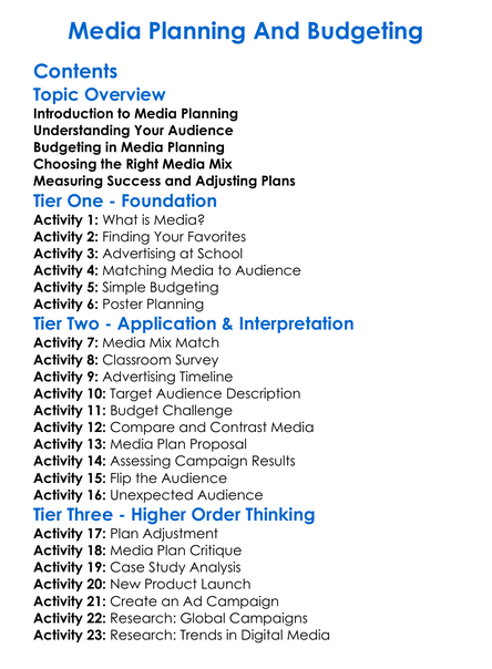 Media Planning And Budgeting Worksheet Activity Booklet
