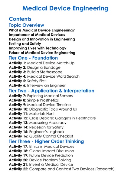 Medical Device Engineering Worksheet Activity Booklet