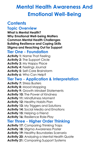 Mental Health Awareness And Emotional Well-Being Worksheet Activity Booklet
