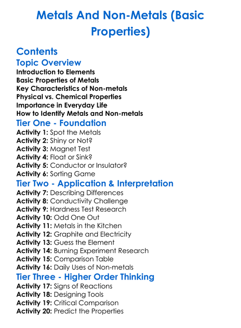 Metals And Non-Metals Basic Properties Worksheet Activity Booklet