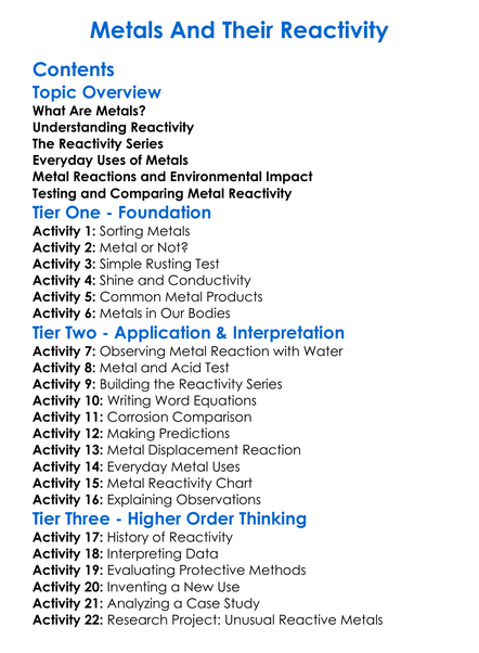 Metals And Their Reactivity Worksheet Activity Booklet