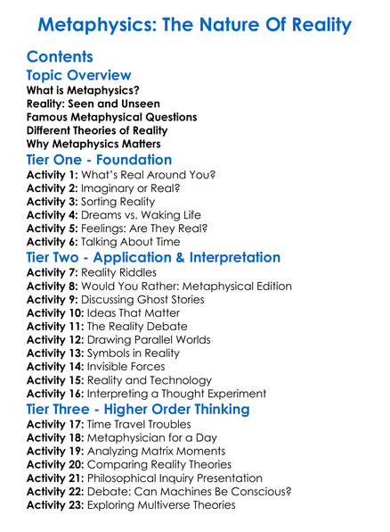Metaphysics The Nature Of Reality Worksheet Activity Booklet