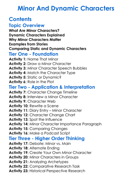 Minor And Dynamic Characters Worksheet Activity Booklet