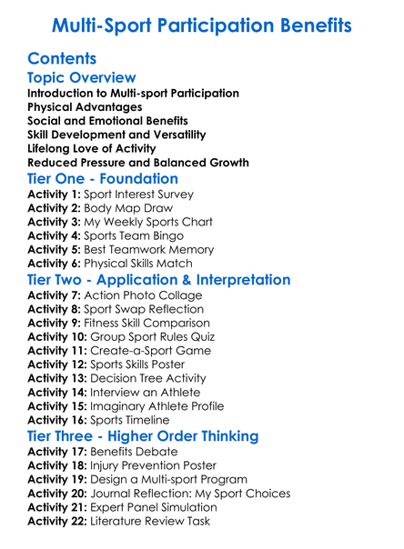 Multi-Sport Participation Benefits Worksheet Activity Booklet