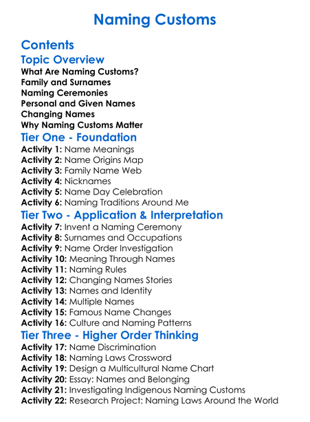 Naming Customs Worksheet Activity Booklet