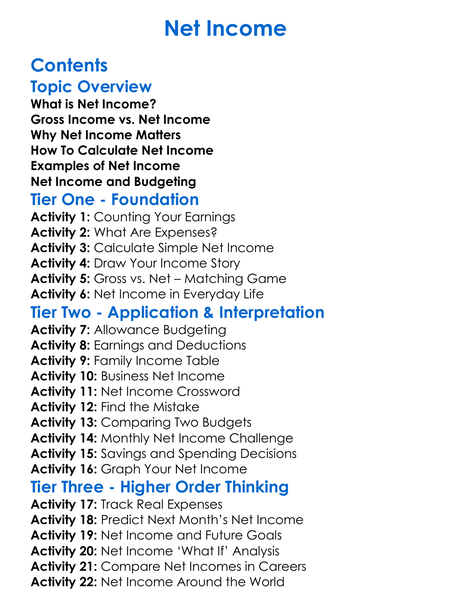 Net Income Worksheet Activity Booklet