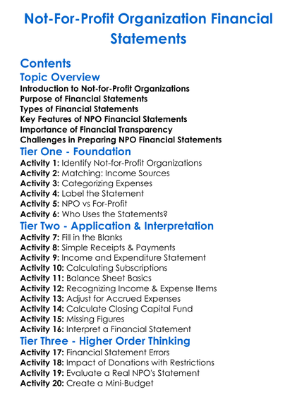 Not-For-Profit Organization Financial Statements Worksheet Activity Booklet