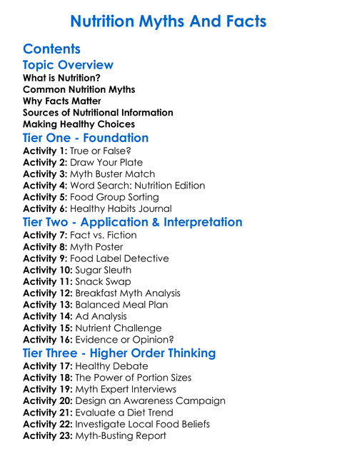 Nutrition Myths And Facts Worksheet Activity Booklet