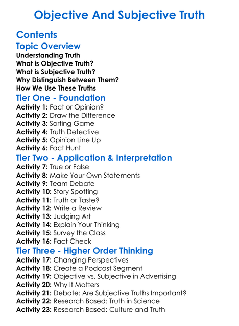 Objective And Subjective Truth Worksheet Activity Booklet