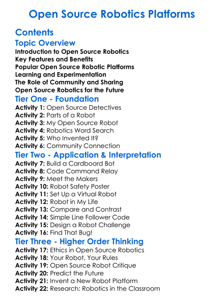 Open Source Robotics Platforms Worksheet Activity Booklet